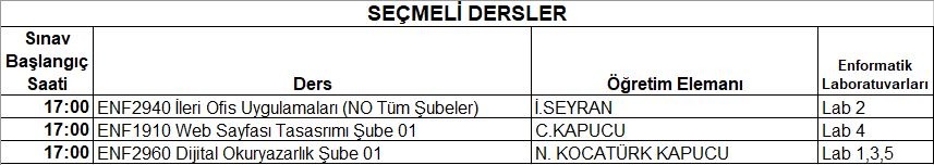 Enformatik bölümü tarafından verilmekte olan seçmeli derslerin sınavları ise alttaki tabloda yer alan planlamaya göre gerçekleştirilecektir.